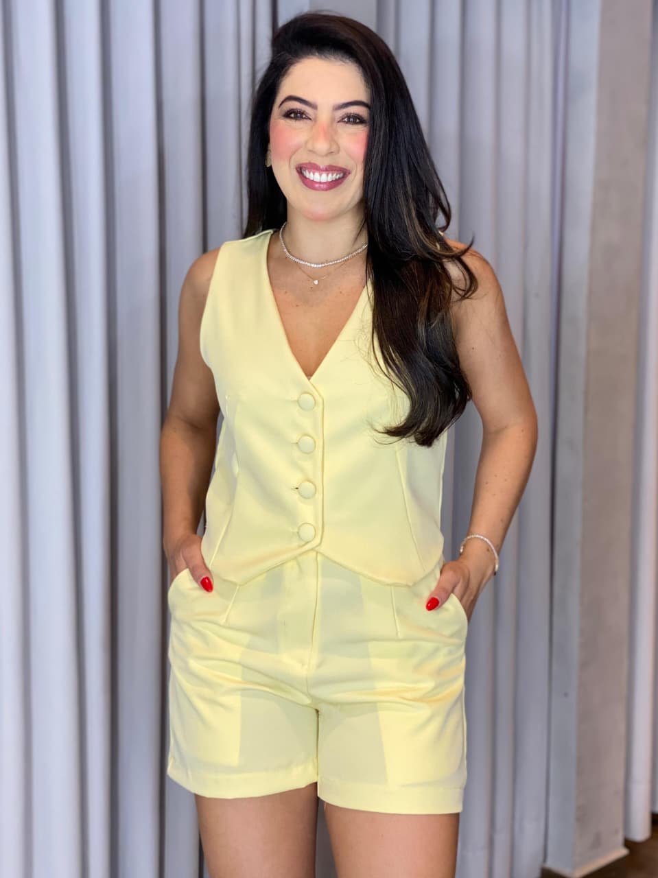 O short possui modelagem reta, com bolsos funcionais e fechamento discreto, enquanto o colete sem mangas traz uma pegada fashion chic com decote em V e abotoamento frontal – perfeito para usar sozinho ou sobrepor camisas e blusas.
