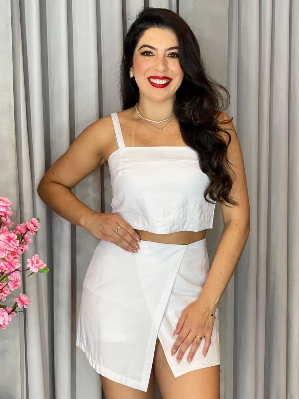O short saia possui modelagem reta, com detalhe transpassado e fechamento discreto, enquanto o cropped sem mangas e fecho atrás em zíper, traz uma pegada fashion chic.