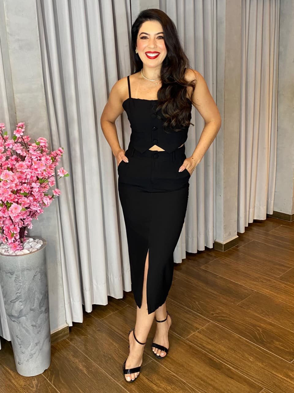 A saia midi possui modelagem elegante que valoriza a silhueta, garantindo movimento e fluidez na medida certa. O cropped complementa o look com design moderno e ajuste perfeito, equilibrando feminilidade e atitude.