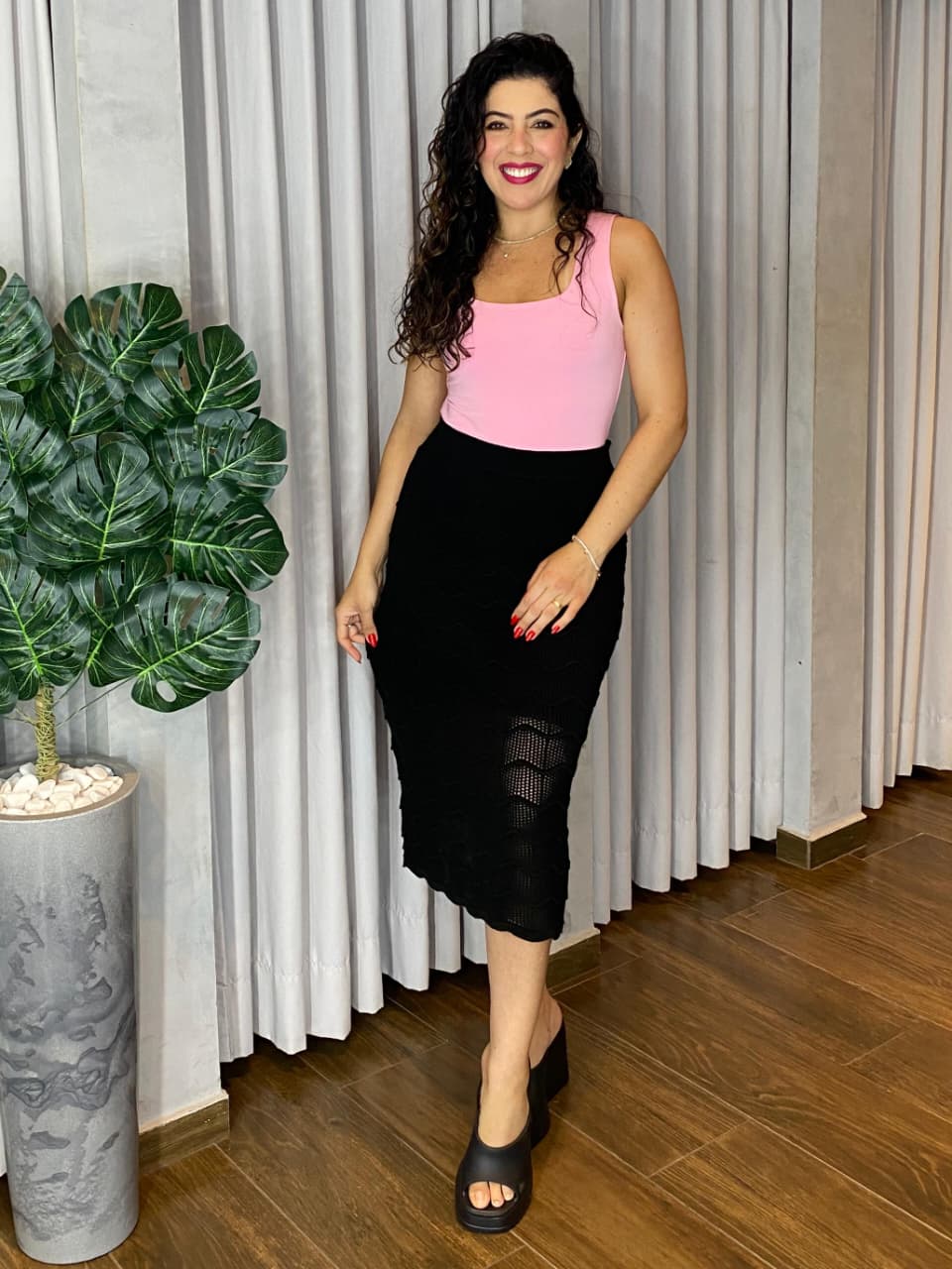 Sofisticação e textura se unem na saia midi modal com trama escamas. Confeccionada em tecido modal de alta qualidade, essa peça apresenta um design diferenciado com trama que remete ao visual de escamas, proporcionando um toque artesanal e moderno ao look.