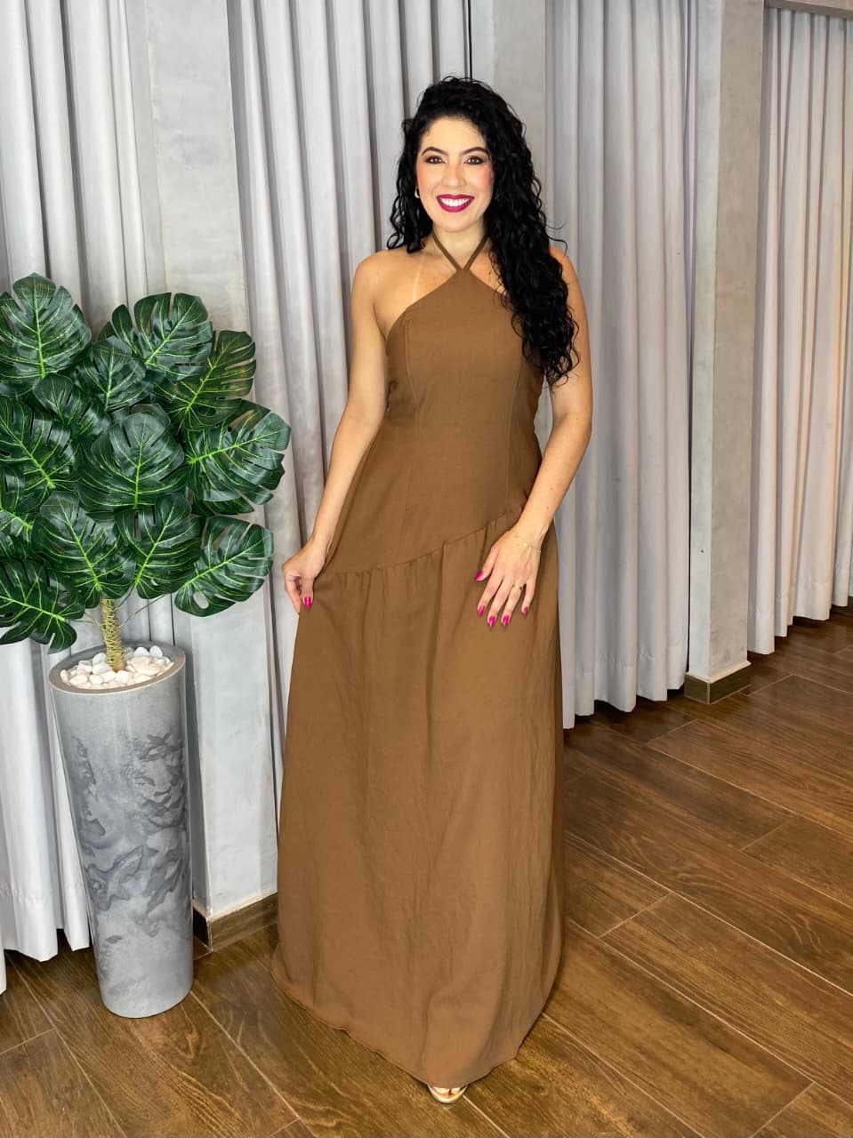 O modelo frente única realça os ombros com delicadeza e feminilidade, enquanto a amarração no pescoço garantem sustentação e conforto, além de um visual atemporal e refinado. A modelagem alongada valoriza a silhueta com fluidez e movimento, tornando o vestido ideal para eventos formais, celebrações especiais ou produções elegantes.