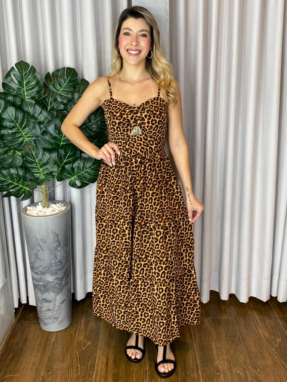 O Vestido Midi Decote Laço Onça é uma opção versátil para eventos, como pool party, aniversário...